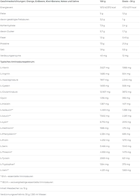Enerji ve Besin Öğeleri: (100g için) Enerji: 1623kJ/384kcal, yag: 5g, doymus yag:3,2g, karbonhidrat: 7,9g,sekerler: 5,7g, lif: 1,5g, protein: 76g, tuz: 1,8g. Eser miktarda soya içerebilir