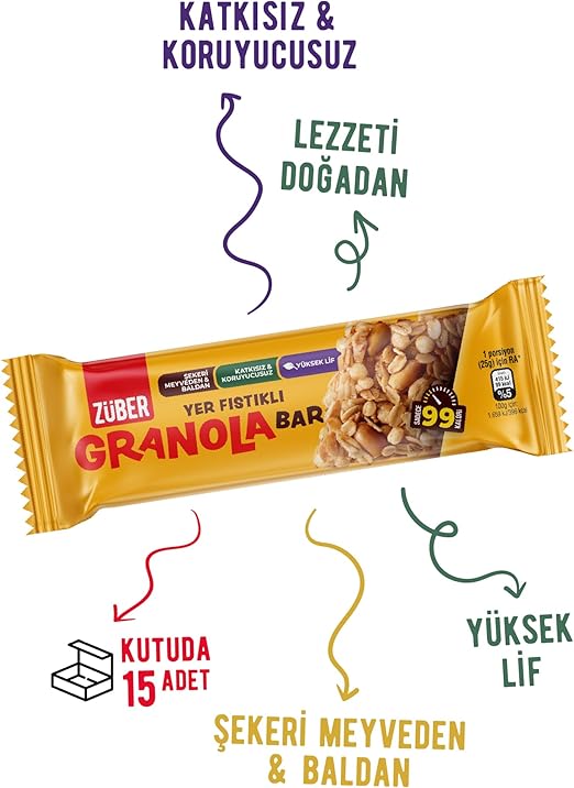 Züber Granola Bar Yer Fıstıklı, 25Gr, 15 Adet
